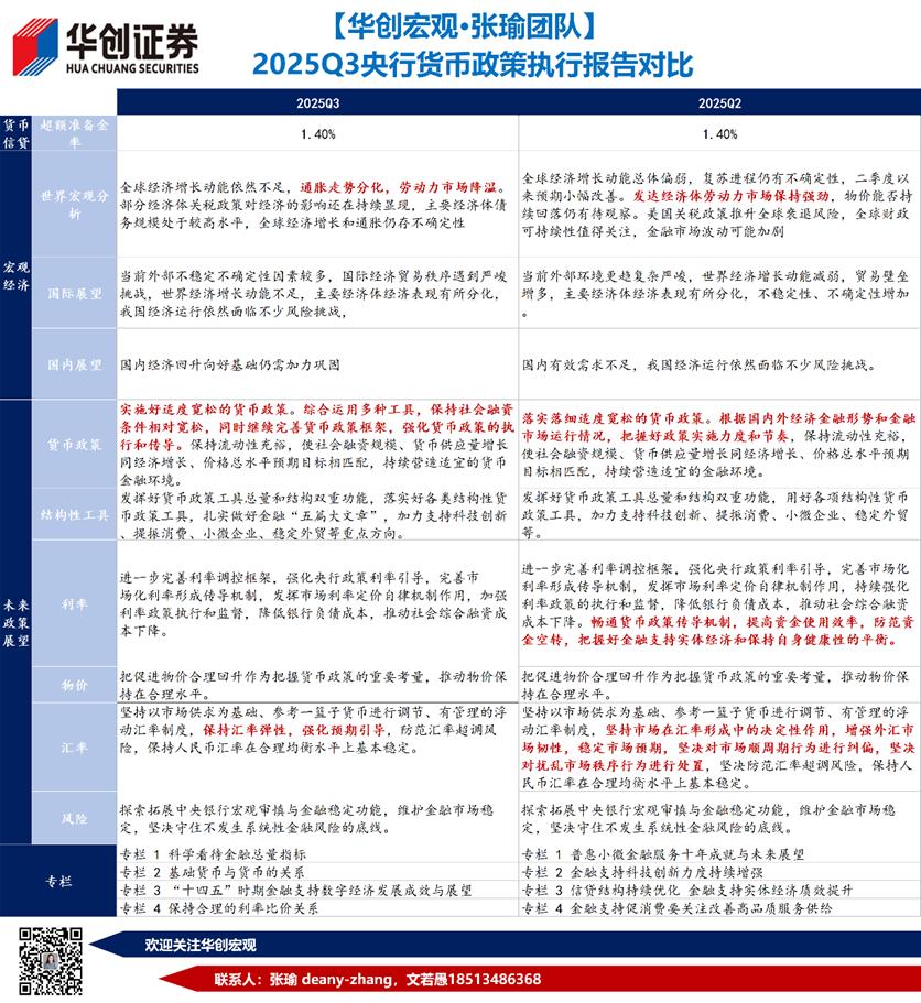 首先,适度宽松本身是一种状态的描述,不必然对应短期货币政策的操作。参照潘行长5月7日在“一揽子金融政策支持稳市场稳预期”会议上对适度宽松的定义:“一是流动性充裕,社会融资条件比较宽松,包括社会融资规模、广义货币供应量这些宏观金融总量合理增长,社会综合融资成本比较低。二是政策实施需要相机抉择,综合评估国内外经济金融形势和金融市场运行情况,运用多种货币政策工具进行动态调整。三是货币政策的取向,是一种对于状态的描述,最近几年人民银行连续多次降准降息,货币政策的状态是支持性的,总量也比较宽松。”截止2025年9月末,M2同比8.4%,社会融资规模同比8.7%,较5%的经济增长目标和2%的价格总水平预期目标而言仍相对匹配。
