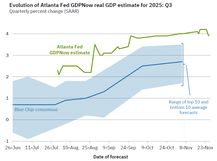 原订昨日公布的美国第三季 GDP 延后至 12 月底,但仍可参考亚特兰大联邦银行的 GDP 预测值,目前预估 3.9%,显示第三季增长强劲,但也意味在政府关门影响下,第四季可能面临更深的季度衰退。