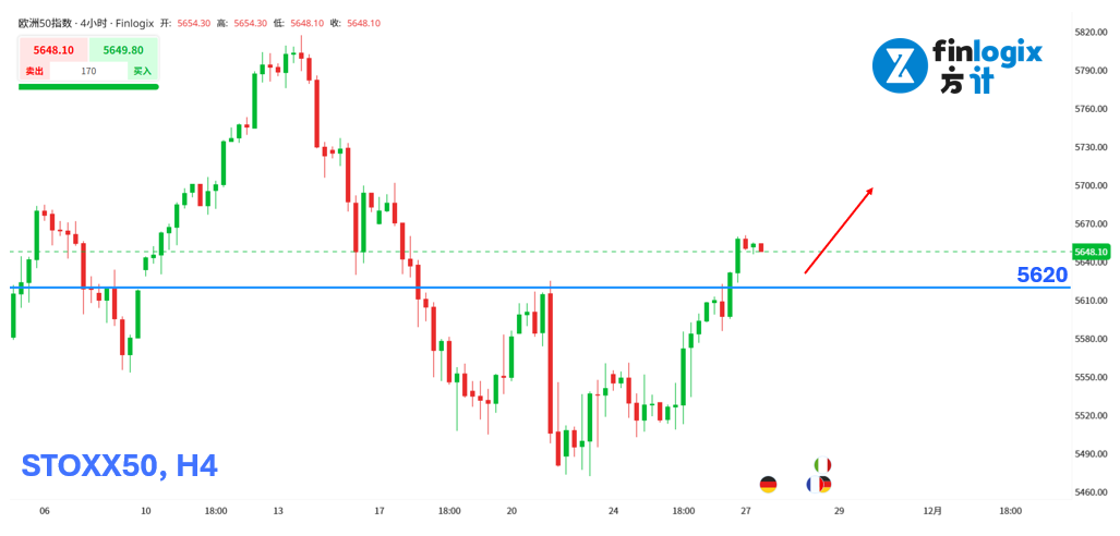 技术面:欧元区经济景气指数已连续两个月优于预期,如果今天公布的数据继续亮眼,可能推动欧洲 STOXX50 指数进一步反弹。技术面也在昨天站上5620颈线,积极者可直接考虑偏多;保守者需考虑修正至5600~5620止跌再介入做多。