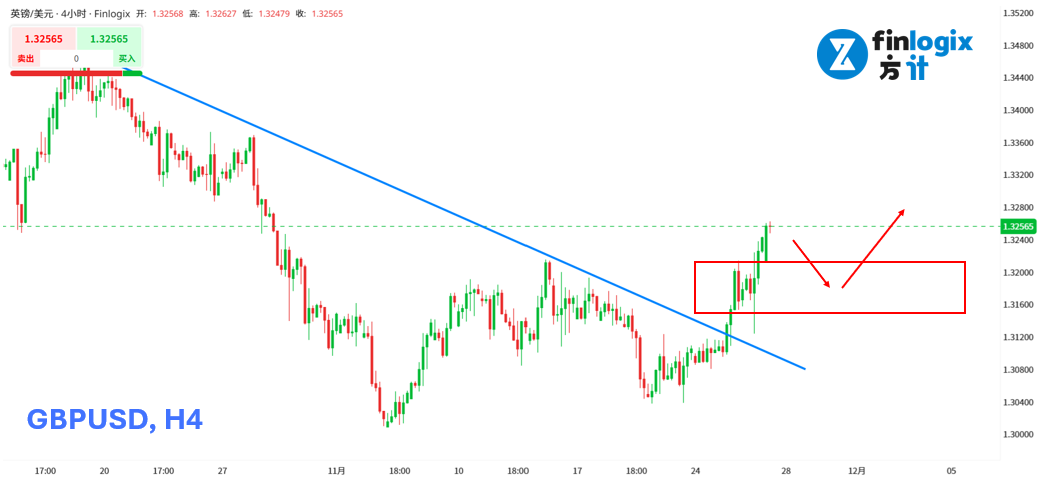 技术面:英国昨日公布 2025 年秋季预算案超预期,显示英国财政前景好转,增强市场对英镑的信心。技术型态突破下行趋势,若日内回踩1.315~1.321不跌破,将有止稳后入场做多机会。