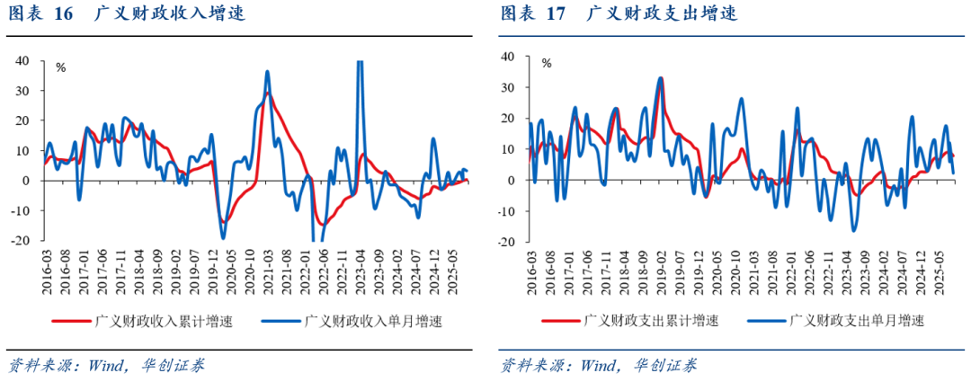 对于税收收入,从拉动结构看,与8月较为类似,主要贡献来自以国内增值税、企业所得税为代表的价格相关税(8、9月分别拉动税收收入增速4.4、5.5个百分点)和个人所得税(8、9月分别拉动税收收入增速1.1、1.7个百分点),如我们在《税收高增的非经济因素》中所述,除去年同期基数较低以外,或对应三个非经济因素正在发生变化——企业反内卷修复税收经济剪刀差、政府反内卷提升实际税率、资本市场交易活跃带动相关税收。