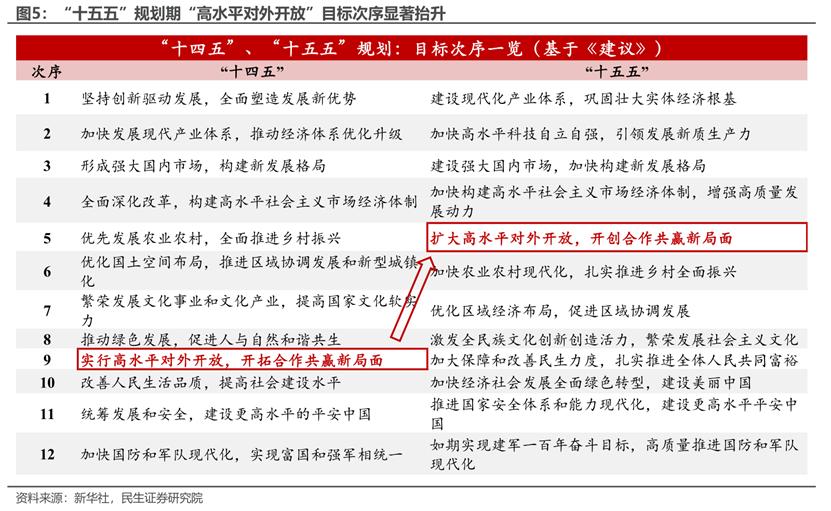 “高水平对外开放”优先级提升,企业出海和中国“再全球化”迎来红利。对比“十四五”,“十五五”规划期将“高水平对外开放”的能级显著提升,且定调也从基础的“实行”转向更进取的“扩大”。要“在激烈国际竞争中赢得战略主动”,开放就要继续“扩大”和“共赢”,在核心产业链保留在境内的基础上,支持企业“走出去”。通过积极推动中国“再全球化”以塑造自身确定性。