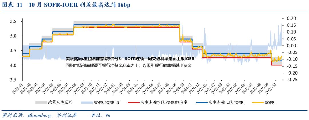 指标3:SOFR是否连续一周突破利率走廊上限IOER当回购市场(非银机构为主体)与中小银行流动性均出现短缺时,回购市场利率SOFR提高至银行准备金利率之上,以吸引银行向非银融出资金。10月14日以来,SOFR-IOER利差开始稳定突破IOER,利差最高达到16bp,同样反映了非银机构流动性环境正在大幅收紧。