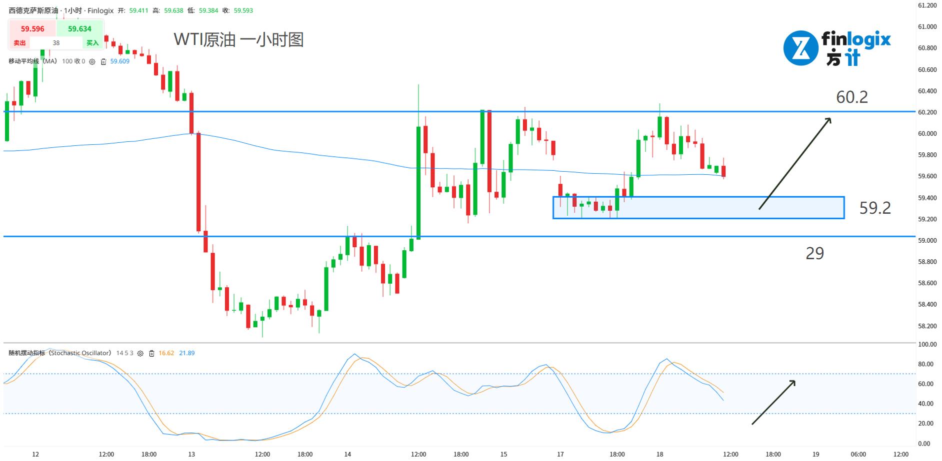 技术面: 100均线水平,油价处在箱体震荡结构当中,应该以高抛低吸为主。考虑到最近行情动能较大,低位接多应该配合随机指标的超卖区金叉,来提高反向入场的胜率。如果跌破59关口,则箱体结构扩大至58.2-61.2。