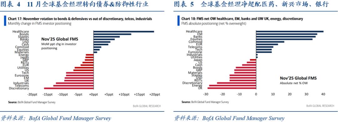 根据2025年11月的美国银行全球基金经理调查,全球基金经理环比增加了在医疗保健、债券、必选消费、银行、美元以及现金上的仓位,同时降低了在可选消费、通信、工业、英国和欧元区上的仓位。与此同时,全球基金经理在医疗保健、新兴市场、银行、股票和商品上超配最多,在英国、能源、可选消费、REITs和美元上低配最多。
