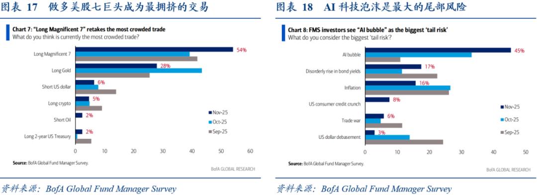 根据美银全球基金经理调查报告,AI科技泡沫仍然是最大的尾部风险。2025年10月,33%的基金经理认为AI科技泡沫是最大的尾部风险,其次是第二轮通胀(27%),第3位是美联储丧失独立性&美元贬值(14%)。2025年11月,45%的基金经理认为AI科技泡沫是最大的尾部风险,其次是债券收益率无序上涨(17%),第3位是通货膨胀(16%)。