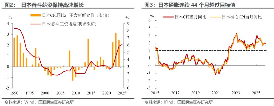 具体来看,本次加息源于通胀粘性与汇率压力的双重“倒逼”。日本关键通胀指标已连续44个月高于央行设定的2%目标,11月核心CPI同比上涨3.0%,进一步夯实了日央行的加息路径。与此同时,2025 年日本“春斗”工资涨幅达 5.25%,叠加劳动力市场持续紧俏,“工资-物价”螺旋式上升态势进一步巩固,这也让日本央行确信通胀目标具备可持续实现的基础。