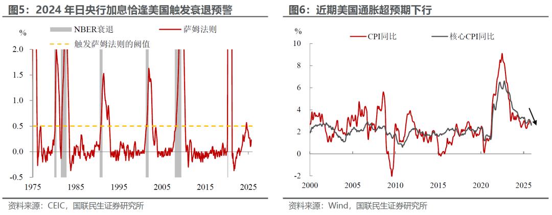 而此前市场一度担心的日元套息交易反转的短期风险也相对可控。一方面,本次加息过程中,日央行开展了更充分的预期管理和市场沟通,政策冲击相较于2024 年7月明显减弱;另一方面,2024年套息交易加速平仓的催化剂,更多源于美国失业率上升触发“萨姆法则”、引发市场恐慌情绪所致,而近期美国市场利好因素增多,不仅非农就业数据走势相对平稳,通胀更是超预期下行,隔夜美股一度大幅走高,市场整体情绪偏向乐观。