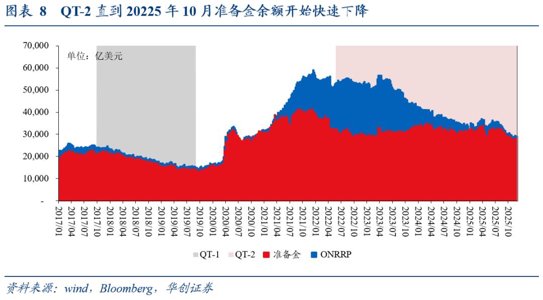 QT-2:启动缩表后先收缩ONRRP余额,今年10月后准备金余额才出现快速收缩。2022年6月正式启动缩表,但由于有庞大的ONRRP池子(6月初约2.1万亿美元),因此缩表早期先收缩的是ONRRP用量,这一阶段准备金余额相对平稳,大致维持在3.2-3.3万亿美元左右;直到2025年10月ONRRP收缩至100亿美元以下后,准备金余额才快速下降至不到2.9万亿美元。触发准备金余额快速下降的因素可能为:政府关门导致TGA余额持续累积有关,变相从市场回笼流动性。