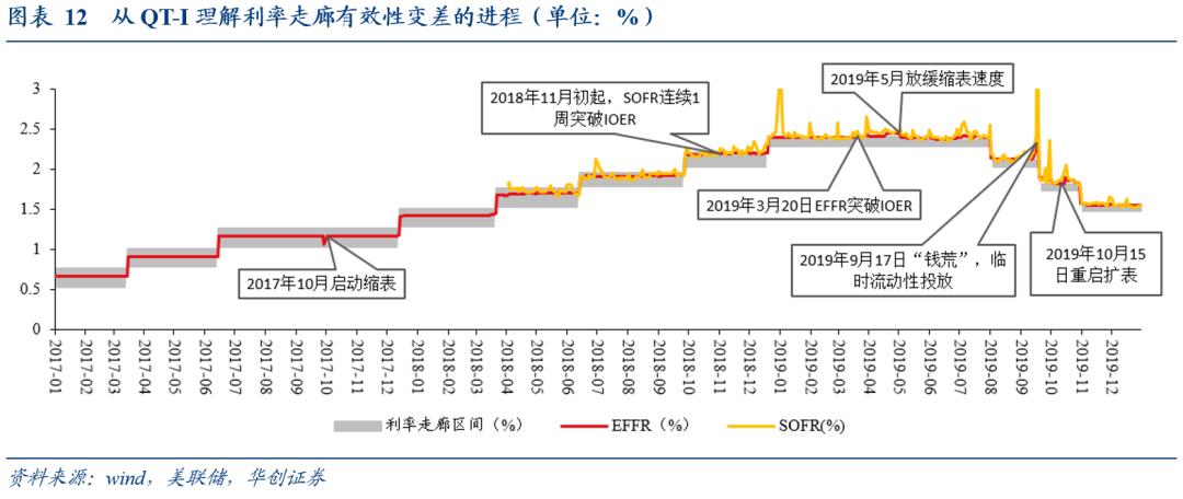 QT-1中,2018年11月初起,SOFR频繁出现连续一周突破IOER且利差普遍在5bp以上,回购市场利率率先不受利率走廊限制。