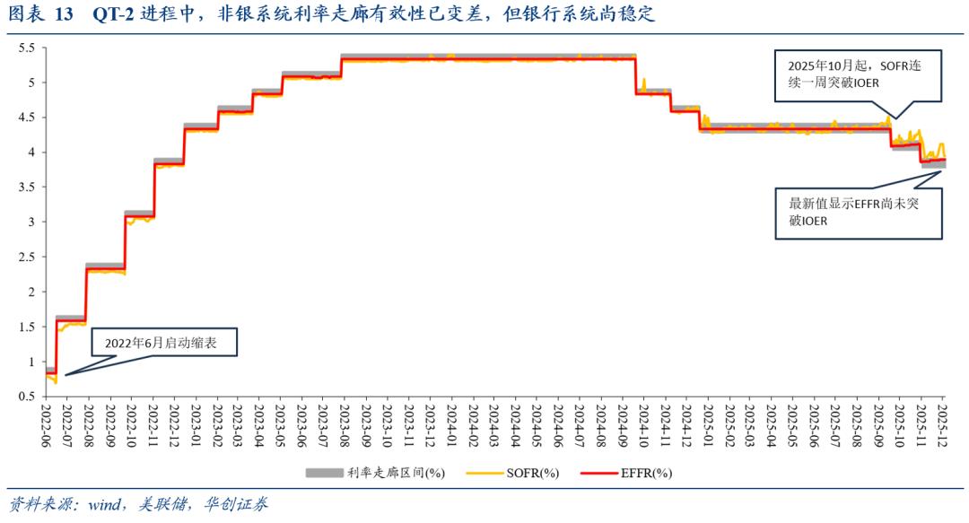 QT-2进程中,随着ONRRP余额耗尽,2025年10月起SOFR开始出现连续一周突破IOER的情况,即非银系统利率走廊有效性已变差。