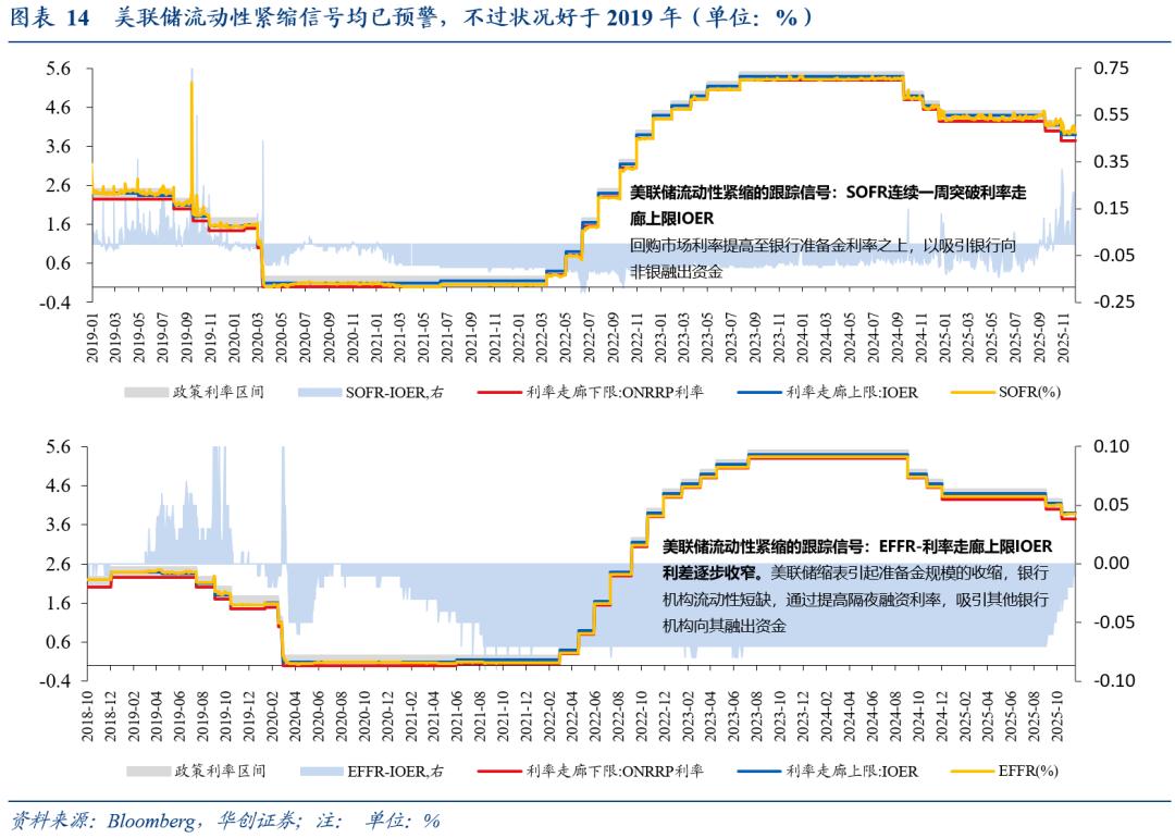 QT-2中,EFFR-IOER利差从2025年9月以来开始持续收缩,最新值在-1bp,并未出现转正,反映了银行机构流动性尚未短缺。但若非银机构流动性继续短缺,或将进一步传导至银行机构。