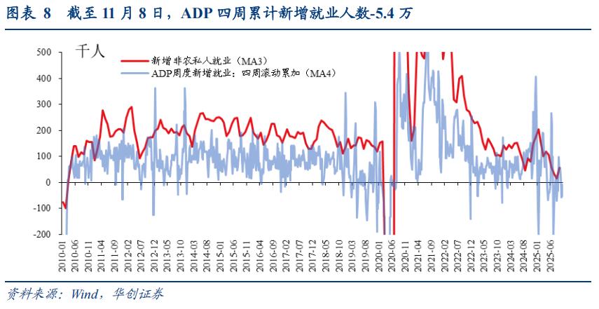 ADP周度新增就业落入负区间。截至11月8日,ADP四周累计新增就业人数-5.4万,前一周为-1万。
