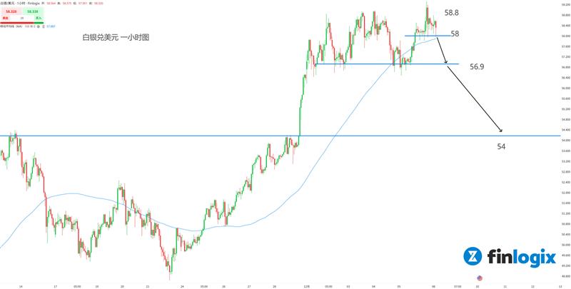 技术面:100均线出现拐点,白银逼空行情可能接近尾声,为了确认空头力量,需要等待突破动能。日内关注58小周期颈线,短线则关注56.9大周期头部颈线。采用突破跟随波段交易为主。不过想要突破56.9需要消息面刺激,例如高于预期的职位空缺,或美联储意外不降息。