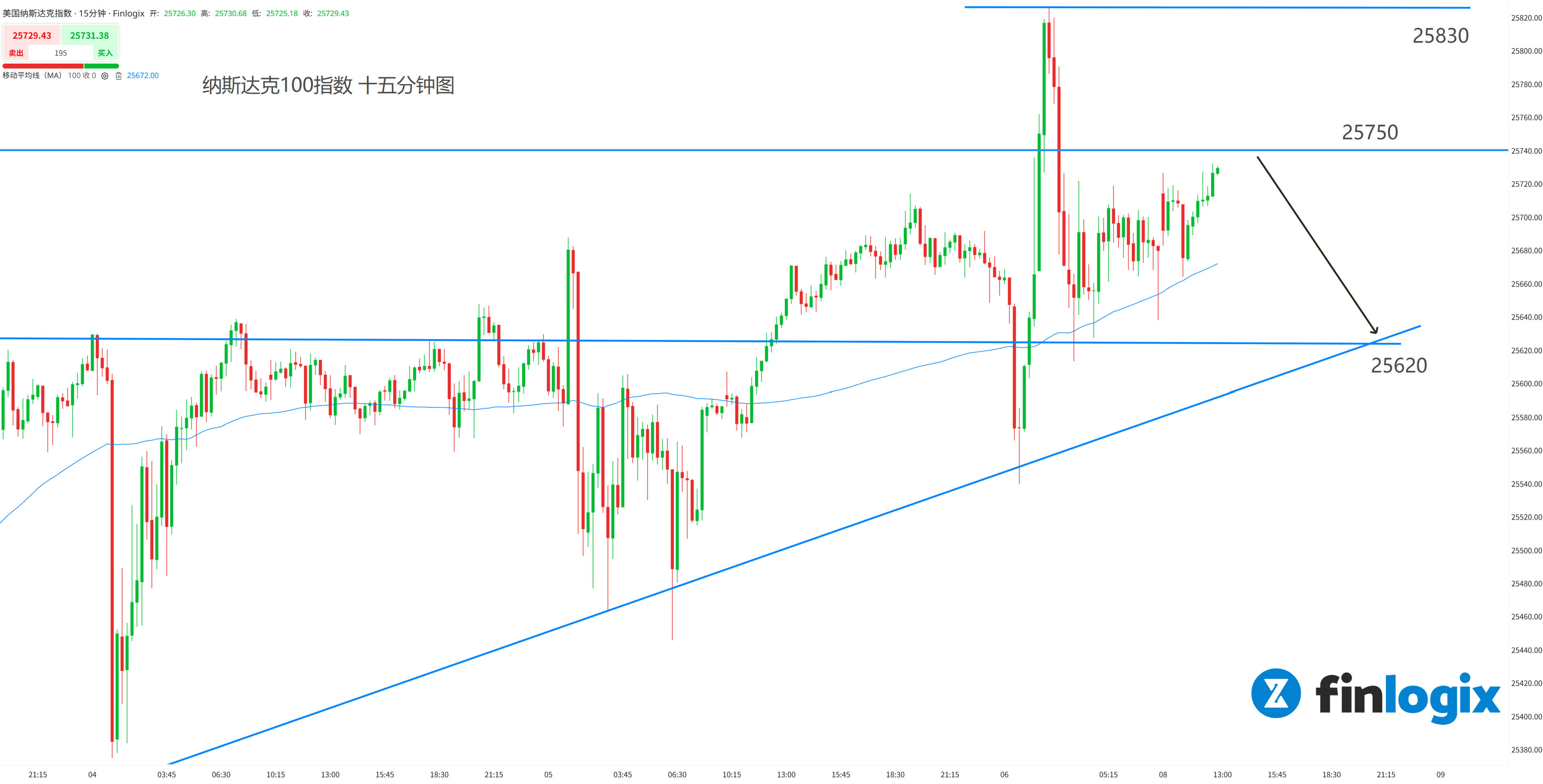 技术面:100均线向上,空单逆向设好止损。25800是历史最高价的头部颈线结构,也是关键的支阻互转水平线,存在较强阻力效果。趋势线和突破前高将提供支撑,作为止盈点参考。