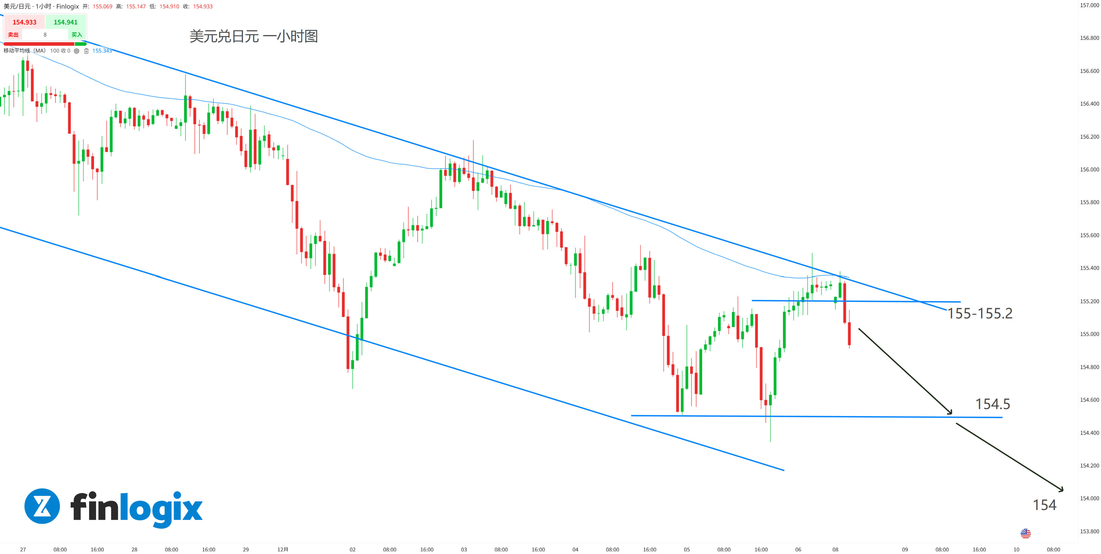短线交易策略:(趋势跟随)155顺势跟空,或突破154.5跟随做空