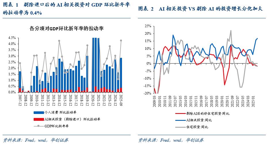 三季度AI相关投资对经济的拉动保持了较强增长。参考我们在《》的口径:三季度美国GDP环比折年率4.3%,其中剔除进口后的AI相关投资对GDP环比折年率的拉动率为0.4%;今年上半年的拉动率为0.3%,净进口占AI相关投资的比重稳定在21%左右。