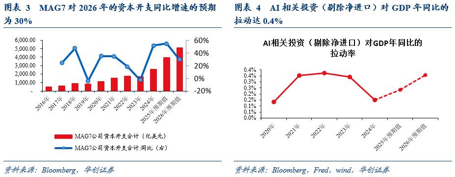 一则,AI相关投资在科技巨头的CAPEX支出支撑下有望保持较快增长。我们在《有,但没那么强——AI对美国经济贡献的思辩》同样指出,MAG7资本开支与AI相关投资的走势高度相关:MAG7对2026年的资本开支同比增速的预期为30%,对应AI相关投资的同比增速约为9%;考虑到2025年AI相关投资中净进口的比例为21%,因此线性外推至2026年,即AI相关投资(剔除净进口)的同比增速约为9%(2025年预计为6%),对GDP年同比增速的拉动率可达0.4%(2025年预计为0.2%)。