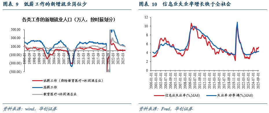 低薪工作的新增就业岗位少,工作不好找。美国的低薪工作(时薪低于社会平均,剔除教育医疗和休闲酒店业)主要包括了制造业、运输仓储业、零售业等,为典型的“蓝领”工作,而上文提到美国传统制造业偏弱、商品需求偏弱,也带来这些“蓝领”工作的用工需求大幅走弱,2024年起,低薪工作(剔除教育医疗和休闲酒店业)的新增就业人口不到10万人,处于非经济衰退期的偏弱水平。