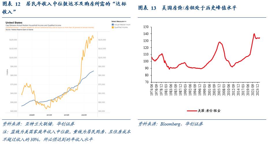 第二,购房市场冷:普通人的“购房梦”遥遥无期。2023年以来美国房屋销售持续低迷,居民购房能力弱,一方面体现在抵押贷款利率处于高位;另一方面也体现在美国当前房价持续高涨,美国房价/房租处于历史峰值水平。根据亚特兰大联储的估算,居民购房、且住房成本不超过收入的30%,所必须达到的年收入水平目前已达到12万美元/年,而居民年收入中位数仅8.5万美元/年,且这一差距正在持续扩大。