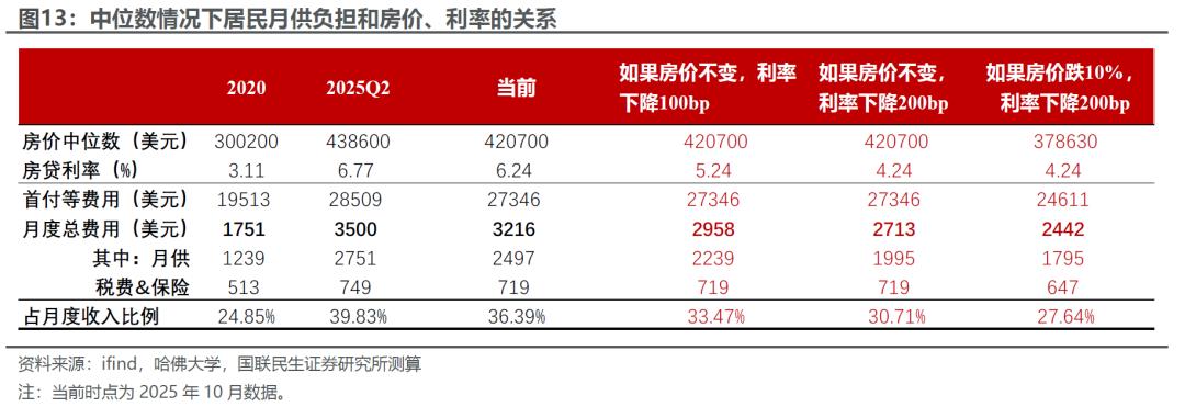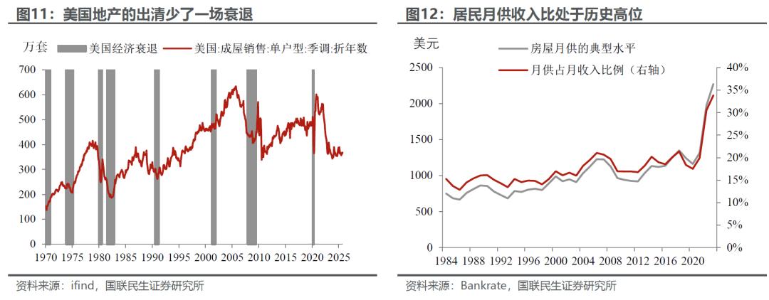 本轮美国地产最大的问题在于,地产下行周期(房屋销售下行)内房价反而大幅上涨。因此,“高利率+高房价”的反常组合,使得美国居民月供压力处于历史高位、地产的需求被压制,而房价上涨既有结构性不足的原因,也有成本上升(比如关税)的因素。