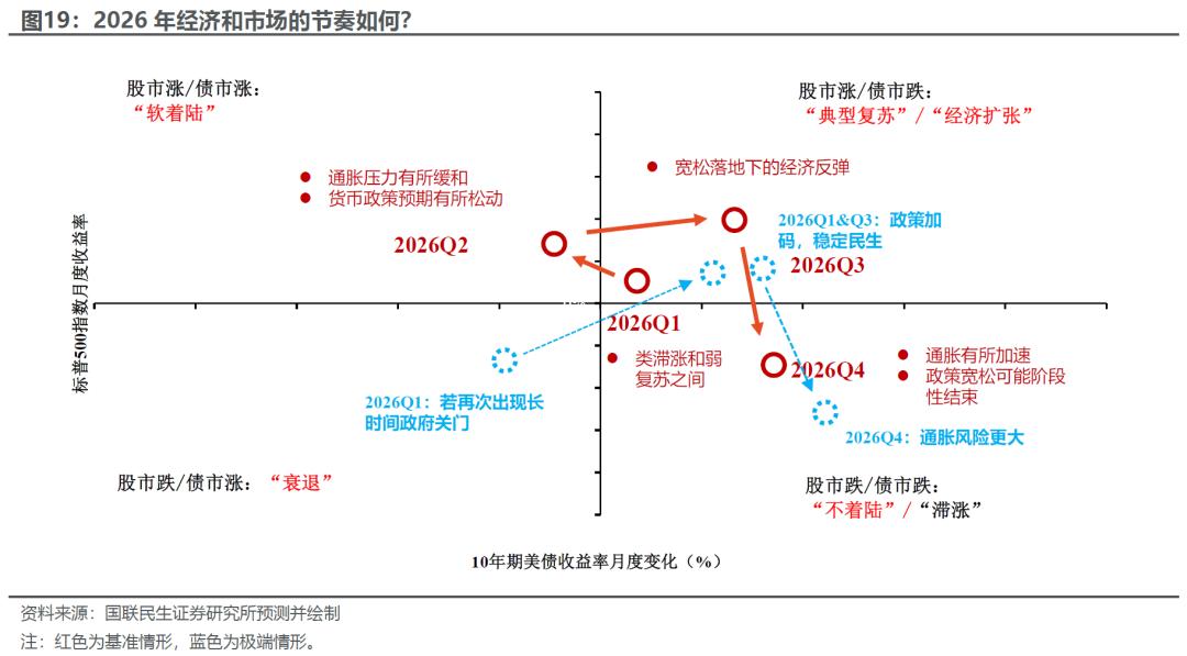 当然,如果我们考虑极端的情形,比如两党在医疗法案谈判上破裂,2026年1月底开始,再次出现长时间的政府关门,今年10月至11月初的情况有可能再次出现,经济继续受负面冲击。由于“开门黑”导致民意受损,第二、三季度白宫可能要更加激进地补偿选民,包括加大财政支出和补贴、以及加速降息,经济会反弹,到那时通胀的担忧也会更大些。第四季度,市场对于来年的紧缩预期可能也会更强烈一些。
