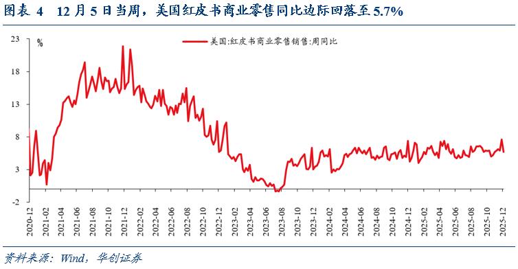 美国红皮书商业零售同比增速边际回落。12月5日当周,美国红皮书商业零售同比降至5.7%,前一周为7.6%。