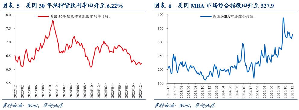 抵押贷款申请数量回升。12月5日当周,美国MBA市场综合指数(反映抵押贷款申请数量情况)升至327.9,环比前一周上涨4.8%。